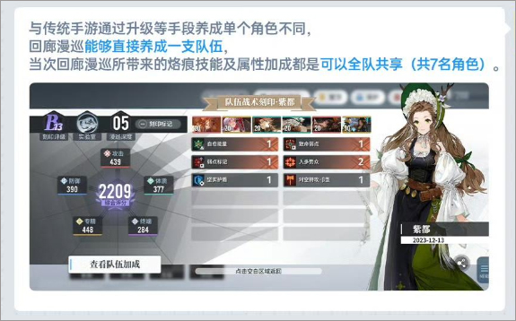 1、回廊漫巡是一个偏向探索的玩法,每次操作一个小队进行探索,途中会有各类事件(属性奖励、技能奖励、战斗等),最终在完成漫巡时获得一个【精神蚀刻】,这个蚀刻上会带有这次漫巡获得的所有属性和技能奖励,这个蚀刻只能由这次漫巡的队长装备,队长装备后全队都能享受蚀刻的属性和技能,另外队长还有个buff,获得的属性效果是120%