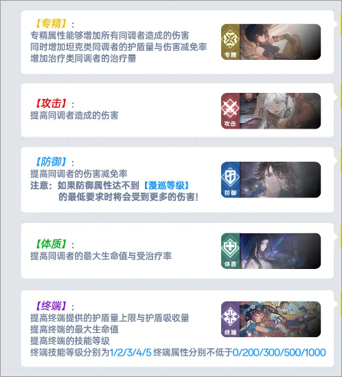 分别有专精、攻击、防御、体质和终端