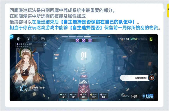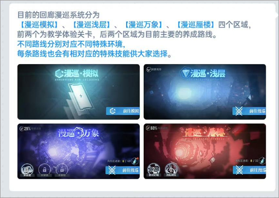 游戏的核心玩法“回廊漫巡”以探索为主,每次派遣一个小队完成任务,途中会触发各种事件,并在最终获得一个【精神蚀刻】道具。这个道具能大幅提升队长及其队伍的属性和技能,是提升实力的重要途径。此外,角色的位阶、记忆烙痕的练度以及解锁更多漫巡节点都是影响玩法深度的关键因素。