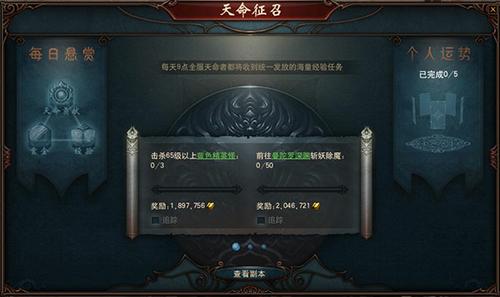 按界面要求击杀对应怪物,奖励:经验、金钱、天命贡献。