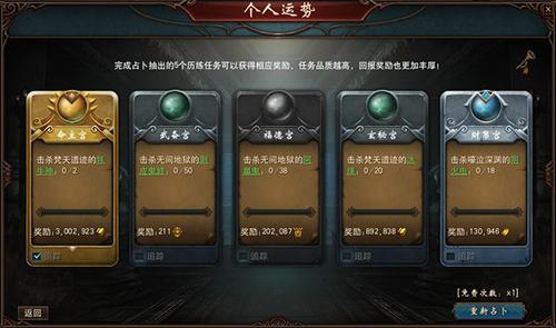 点界面中的卡牌抽取5种运势任务,击杀对应怪物完成,可获得经验、金券、天命贡献、帮贡等奖励(白色任务奖励低,紫色任务奖励高。即:白<绿<蓝<黄<紫)。