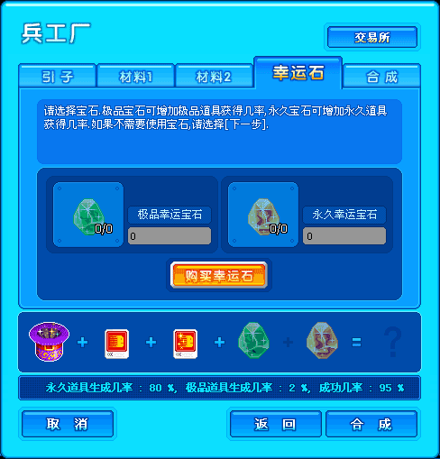 *增加极品幸运宝石和永久幸运宝石,可以分别提高道具合成极品的几率和提高道具合成永久的几率。