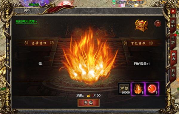 通过界面上的熔炉按钮,便可进入神火界面。神火等级分为:幽冥鬼火、太阴真火、太阳真火、紫薇天火、南明离火、三味真火、六丁神火、九天玄火、红莲业火。