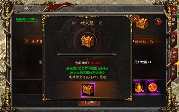 4、每充值100灵符可获得1点神火值,累积获得10 0点神火值即可点击右上角的宝箱图标开启1次神火宝箱,获得丰厚奖励。