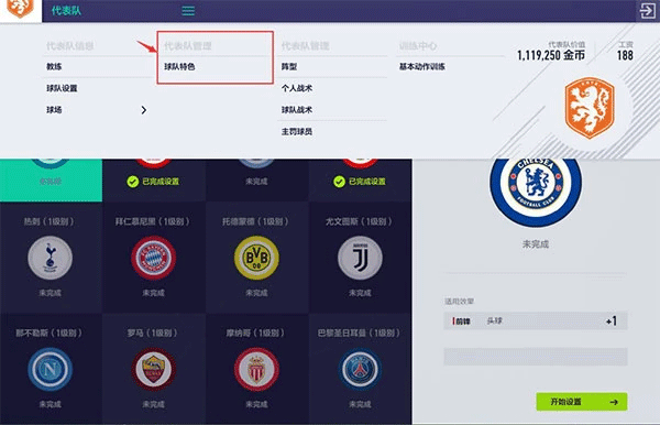 达成【球队特色】的条件也能让球队的能力更进一步,玩家可以在主界面的【球队特色】入口开启球队特色设置界面。