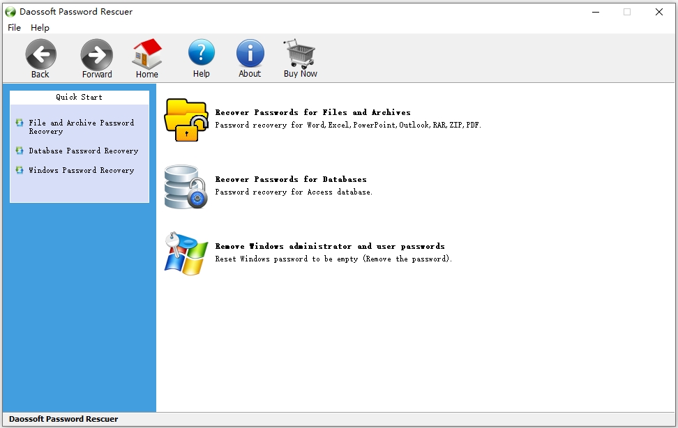 Daossoft Password Rescuer是一款一体化密码恢复工具,该软件可以恢复Windows、Excel、Word、Access、PowerPoint、Outlook、RAR/winrar、ZIP/WinZIP、PDF等密码,超过70种类型密码可以立即恢复。适用于新手和专家的有用密码恢复软件,无需技术技能,无需拨打昂贵的PC技术人员。特别是针对 WinRAR、RAR 或其他归档软件的全部版本号,能够轻松恢复其创建的 RAR 存档的密码,需要的用户欢迎前来下载使用。