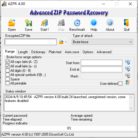 azpr4.0官方版,全称为advanced zip password recovery,是目前行业领先的zip密码破解软件,与同类软件相比,azpr4.0功能更为强大,一般6位数字的密码,zip只需要几十秒就能解开;同时软件能够支持暴力,掩码,文本和字典四种破解方式,支持自定义大小字母,数字,特殊字符,以及密码长度,是你破解zip文档的好帮手。