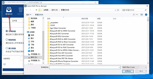 2、点击添加rar,在本地选择一个RAR文件,然后点击打开;
