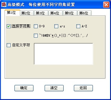 “每位使用不同字符集”即为密码的每一位设定一个生成字符集,此功能是木头超级字典生成器独创,实用性很强。需要先在“设定密码长度”中设置密码最小长度和最大长度。然后勾选“每位使用不同字符集”,会弹出“高级模式-每位使用不同字符集设置”对话框,然后参照上面的方式为密码的每一位设置生成字符集。如果没有为某一位设置生成字符集,则被忽略生成字典的字典也自动减少一位。点击“清空”按扭可以清空所有的设置,点击“确定”后你的设置即已保存。然后点击“生成字典”,按扭,即进入字典文件生成生成环节,请看下面第二步。