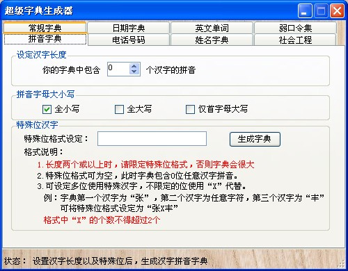 点击“拼音字典”选项卡进入拼音字典设置,在拼音字典里设置汉字的长度,可穷举汉字组合,然后生成它们的拼音。