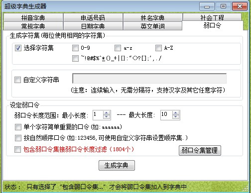 勾选“包含弱口令集并放在生成字典最前面”,在你生成字典时就会把系统内置的弱口令字典加入其中。你也可以通过弱口令集管理来管理系统内置的弱口令集,以备经后再次使用。