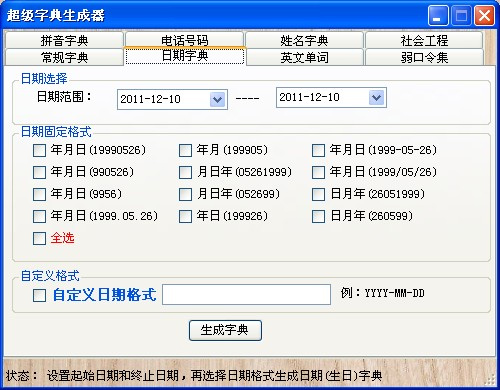 设定日期的范围及日期格式即可生成“生日密码”字典。可多选日期格式,也可自定义日期格式。