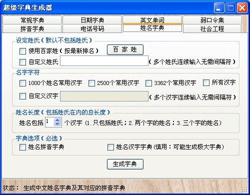 在“姓名字典”选项卡中,可按选择百家姓或自定义姓氏,然后选择名字字符集,可生成中文姓名字典或拼音姓名字典。