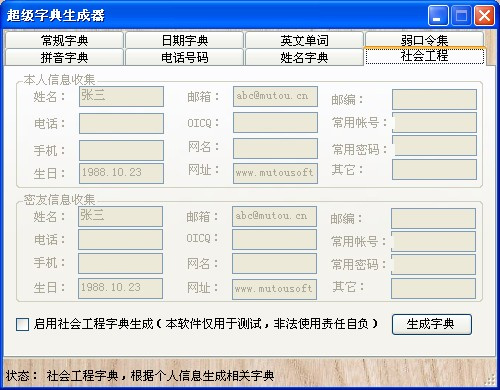 首先进行字典生成设置,你可以完成常规字典、日期字典、英文单词、弱口令集、拼音字典、电话号码、姓名字典和社会工程字典设置,然后点击生成字典进入字典文件生成环节。软件自动将所有设置内容生成到同一个字典文件中。完成字典设置后,在任一选项卡中点击“生成字典”即进入第二步。