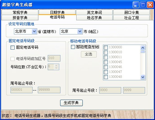 按照电话号码的规则生成字典,可设置地区,软件自动查询该地区的手机号码和区号,得到该项地区的所有电话(手机)号码。