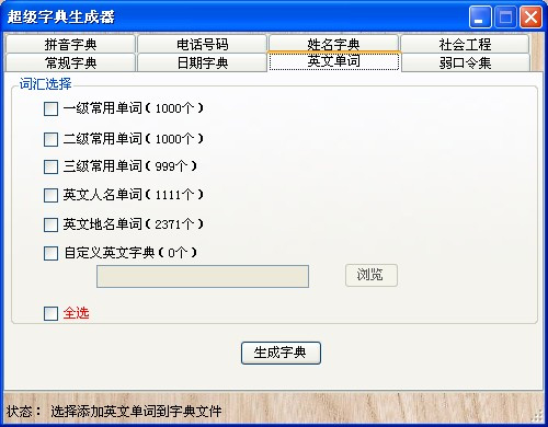 点击“英文单词”选项卡,即进入英文字典生成设置。在词汇选择栏中勾选相应的选项:“一级常用单词”为最常用的英文单词,还有二级常用单词、三级常用单词、英文人名和英文地名,你还可以自定义词典文件加入其中。当你勾选相应的选项时软件会自动重新计算字典大小。你也可以点击“查看编辑文件”来查看或修改相应字典文件。
