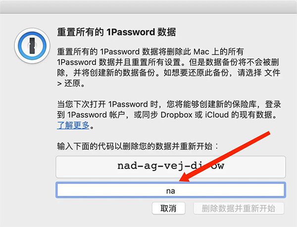 1、1password-帮助-故障处理-重置所有1password数据,选择“na”选项,