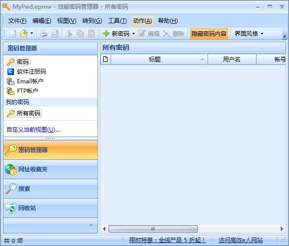 效能密码管理器是由易飞科技出品的一款专业、易用、跨平台的密码管理软件。使用该软件,从此你只需记住一个密码,就等于记住所有密码,有了它,您就不会再忘记或是搞混重要的密码了,既节约您的时间,又带给您愉悦的心情!