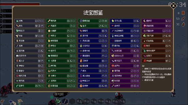 本作总结一个字就是爽,突突突地割草,杀尽所有怪物,有超过60中法宝和20种羁绊可供选择m,法宝可攻可御,法术有攻、有御、有控。法宝可以升级,三个一星法宝可以升级成为一个二星法宝,三个二星升级成一个三星。