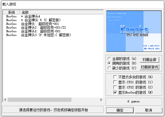 3、所有ROM均以标准WinKawaks148b/DEV版的驱动库为准,不保证能正常使用于低版或高版的KAWAKS模拟器中,也不保证能用在其他模拟如MAME等模拟器中,如有需要,请自行寻找对应版本。