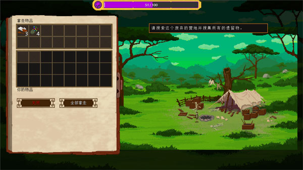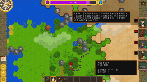 7、游戏上方紫色属性条为你的体力,探索行走会消耗它们,你需要合理进行规划,才能在这里生存探索下去;