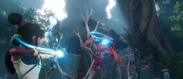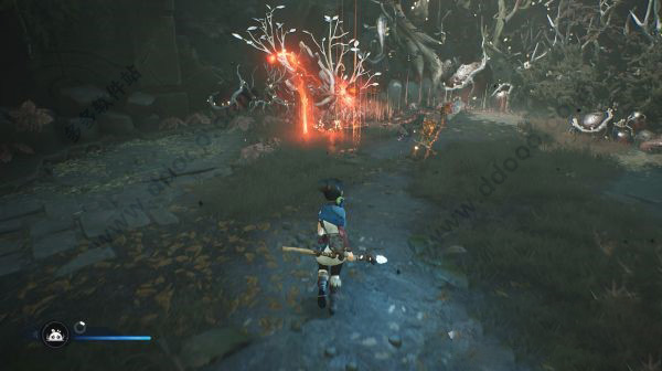 在前方再次见到神秘灵魂,他在召唤出一个较为强大树芽怪后离开。树芽怪的攻击方式非常单一,仅有挥舞手中的武器攻击一种方式。树芽怪的攻击我们可以使用翻滚进行躲避,或者长按E键张开护盾进行格挡。