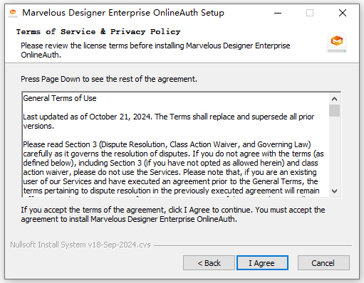 2、双击文件MarvelousDesigner_Enterprise_Online_2024_2_177_Installer.exe开始安装,接受软件协议;