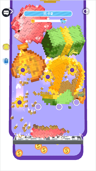 开心消方块是一款特别好玩的消除类手游,画面Q萌可爱,玩起来超解压。游戏规则很简单,就是用手指滑动切开方块,让它们掉到齿轮下面变成金币,然后用金币解锁各种道具,比如锯子、飞轮什么的,帮助自己更快通关。刚开始可能觉得挺简单的,但随着关卡难度增加,方块形状也会变复杂,需要动脑筋才能顺利消除。