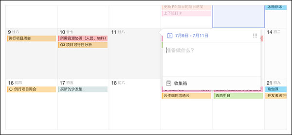 在 Web 的日历月视图中,我们将鼠标放在其中一个格子上,按住鼠标,然后直接向右或者向下拖拽, 就会选中多个日历格子,放手后就能直接创建一个跨天的任务了。