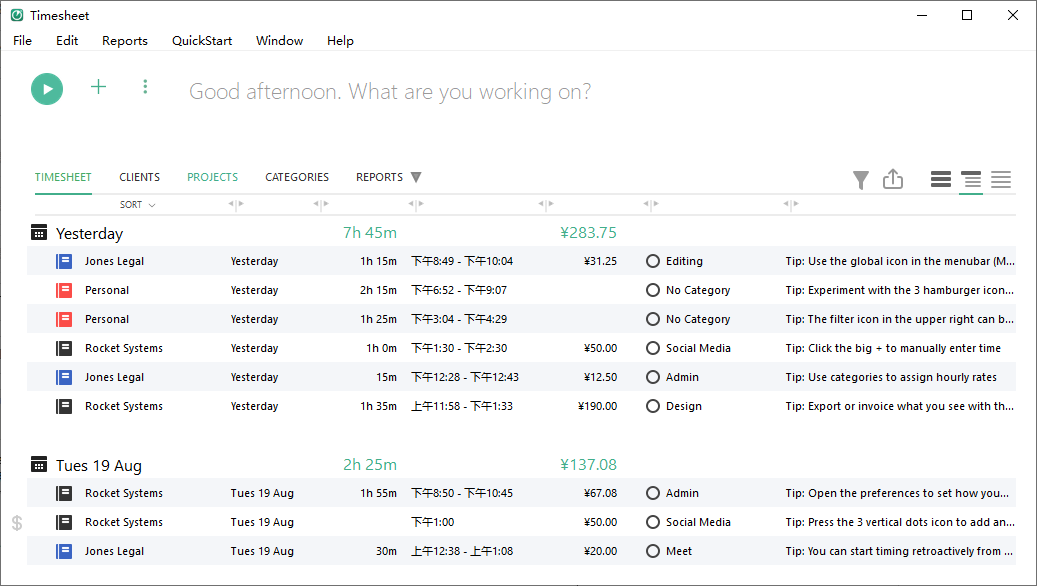 软件的功能也很强大:能跟踪时间和费用,生成报告和组织数据,方便开具发票或提交报销;可以把时间分配到不同的项目里,或者暂停某个项目;在你喜欢的软件中调整时间而不需要离开当前任务;轻松导出数据到Excel或其他电子表格工具;自动记录日常工作内容;还能从上次账单直接生成发票给客户展示总结或详细信息。
