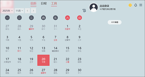 日历是我们生活不可或缺的东西,因此小编这次带来了云日历电脑版,但这不仅仅是一个可查看万年历、黄历、农历的工具,更是一款高效便捷的强大时间管理工具。通过该软件虽然可以帮助用户查看到各种详细的国家节日、法定节假日、农历阳历等详细的信息,但是还可以自定义在这里添加一些纪念日、生日、倒数日等重要提醒,当然也可以添加自己的工作日程,这样就可以更好的管理安排自己的时间,以防错过重要事件。除此之外,在云日历中用户可根据自己的兴趣爱好自定义添加星座运势、车辆限行、天气预报等各种小功能到软件首页中,功能十分全面。