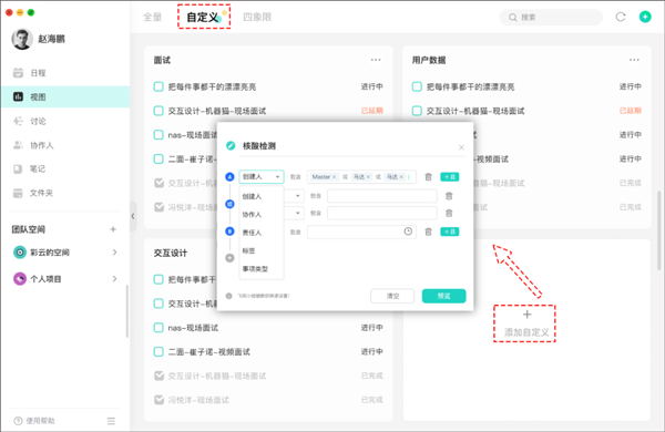 可以根据自己的管理习惯、关注重点自行筛选和组合不同的条件和内容,自定义出满足自己管理需求的看板视图,可自定义多种筛选条件(标签、人员、状态、时间和执行情况等),满足一切个性化管理视角。