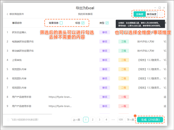 如果飞项中无法满足你的需求,还可以将自己负责的事情进行道出管理,支持将事项的名称、背景信息、标签、类型等元素进行筛选导出(最高支持19个筛选项)