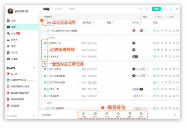 ●批量操作:全量视图批量操作支持批量添加协作人/修改时间/移动到项目/删除/移除人/完成/完结