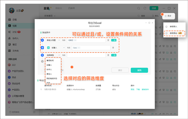 ●根据条件导出:按照筛选条件,如时间、人员、状态、标签所属事项/项目,或者自己已经设定好的自定义视图,筛选条件与自定义视图中一样,可以用且(需要同时满足多个条件)、或(满足其中之一即可)两种组合方式进行多条件的筛选组合,筛选后点击预览。