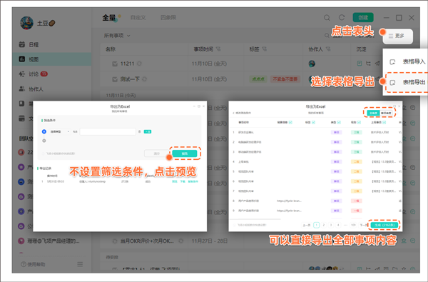 ●详细操作:可以在全量视图/项目列表视图——>点击右上角“更多”——>选择“表格导出”