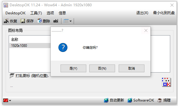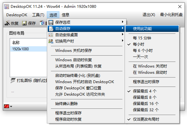 随着大家电脑桌面上摆放的东西越来越多,各种各样的快捷方式,随处可见的临时文本,这些东西都是经常桌面上的现象了,有时候我们为了方便寻找会将它们分类摆放,但是难免某日桌面刷新的时候自动整理了图标,酿成了悲剧,这里小编为大家推荐desktopok中文版,这是一款非常好用的保存桌面图标布局的小工具,可以还原桌面图标位置,能够将桌面图标排列进行记录和保存,出现图标混乱的情况,也可以轻松还原,让你在井井有条的图标群中找到你需要的软件或者文件。另外desktopok软件还可以开启自动保存功能,该功能会每隔一段时间保存一次,这个具体时间用户可以自行设置,总之是一款非常实用的桌面图标工具,有需要的朋友欢迎自行下载使用。