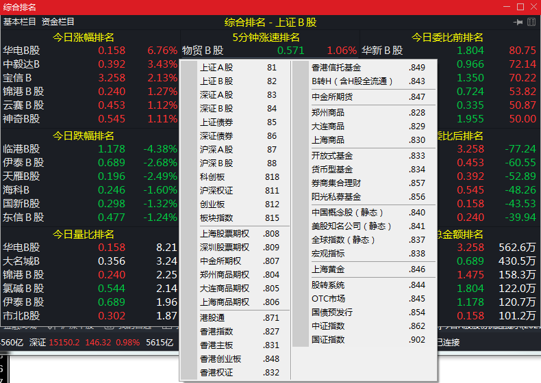 敲数字81、82、83、84、85、86、87,可分别调出上海A、B股,深圳A、B股,沪债、深债,深沪A股的综合排名。系统用9个排成方阵的小窗列出所选市场的股票的涨幅、跌幅、振幅、5分钟涨幅、5分钟跌幅、量比、委比、成交金额排名。