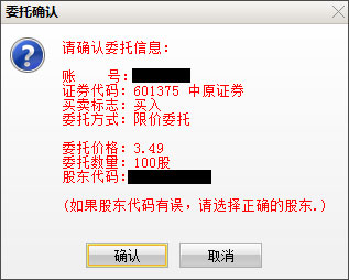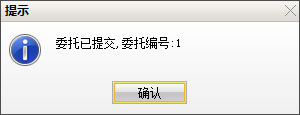7、如果信息有误还可以取消,返回继续填写下单信息,如果正确,当确定之后会返回一个提示信息,内容有委托编号,如果有其他情况则返回原因。