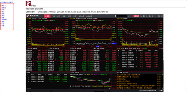 2、全景图模块提供了一个全市场的看盘版面;沪深市场指数、全球知名指数、板块指数、综合排名、自选股、分时图/分析图、市场资讯、要闻精华等同时浏览。