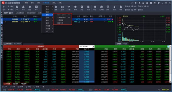 可进行期权T型报价、个股期权报价、交易策略、风险分析操作。