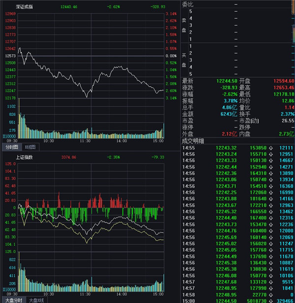 按下F7键就可以进入个股全景页面,个股全景提供了个股所有信息,包括了分时走势、技术分析、大盘对照、TICK走势、成交明细、价量分布、财务图示等七个画面。