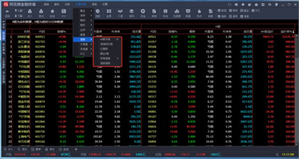 位于终端界面最上方,包括系统、报价、分析、扩展行情、资讯、交易、在线客服、消息、迷你行情、智能、工具、隐藏工具栏、换肤等功能。