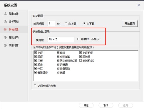 为了方便上班工作炒股用户的使用,我们提供了一键隐藏功能,即通过一个快捷键(俗称“老板键”)将程序界面完全隐藏(在任务栏、托盘区都不留痕迹),如需再次使用,只需要再按此快捷键即可,它的默认的快捷键为:Alt+Z