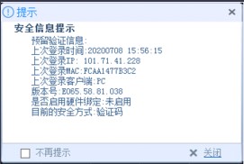 登录后,系统显示上次登录版本、上次登录IP等安全信息,支持用户绑定电脑并修改预留验证信息。