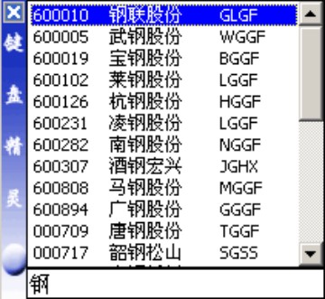 本软件支持汉字输入和模糊查找。这样您不仅可以用键盘精灵实现股票的输入,还可以用来做股票的快速搜索。例如,您输入“钢”字,就会看到所有名称中包含“钢”字的股票(如右图所示)。然后用上下键就可以选择查看了。