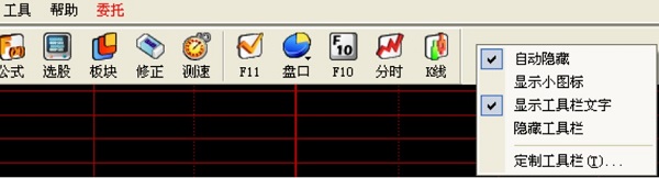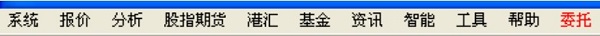 打开软件可以看见系统、报价、分析、股指期货、港汇、基金、资讯、智能、工具、服务、委托等菜单。在这里您能找到几乎所有的功能。其中有些命令旁边有图标,这样便可以很快地将命令与图标联系起来。
