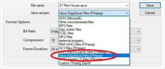 Opus已作为导出选项添加到“文件”>“导出”>“ 导出音频 和 文件”>“导出”>“导出导出多个”命令。可从这些命令访问它,然后从“导出”对话框的“ 保存类型”下拉菜单中选择“ 作品(OggOpus)文件(FFmpeg)”: