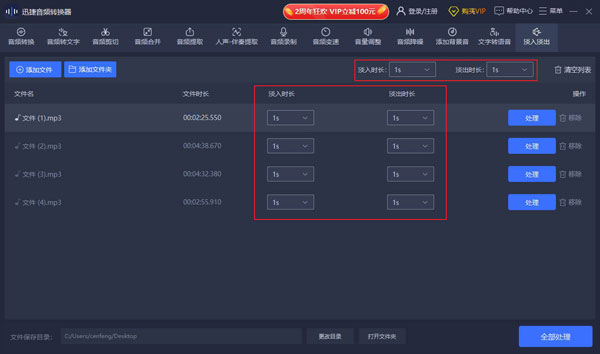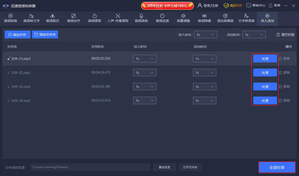 单个文件:选中音频,点击“处理”按钮即可导出设置淡入淡出后的音频文件。 多个文件:点击右下角的“全部处理”按钮,可批量导出多个设置淡入淡出后的音频文件。