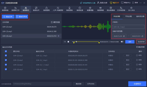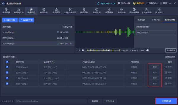 单个文件:在“输出文件列表”中选中音频,点击“剪切”按钮即可导出剪切后的音频文件。 多个文件:点击右下角的“全部剪切”按钮,可批量将多个剪切后的音频文件进行导出。